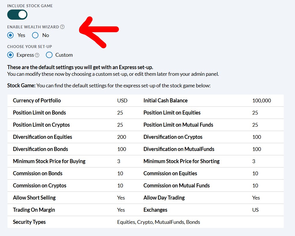 You can choose either Express or Custom setup — just ensure the Wealth Wizard is turned on before launching the contest. Once enabled, participants will have access to the guided portfolio builder inside their trading dashboard.