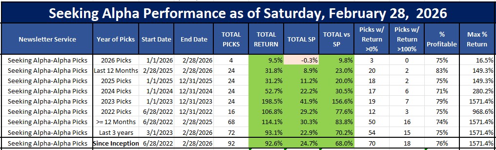 Seeking Alpha Alpha Picks performance as of March 1, 2026Alpha Picks Update as of March 1, 2026: Since its launch in July, 2022, the 92 Alpha picks from 2022 thru 2026 are up an average of 93% and are easily beating the S&P500's return of 25% by 68%. Their 4 2026 picks are already beating the market by 9.8% while the S&P is now down for the year. But most impressively, their picks that are at least 12 months old are up 114% vs 30% for 84% ALPHA and 74% of their picks are profitable. Yes, these picks are almost 4x the SPY. Their October, 2025 pick of Micron is already up 117% and their September picks are up 77 and 74% already in just 5 months, and tehir June, 2025 pick is up 149%. WOW! See our full Seeking Alpha Picks Review for further analysis.